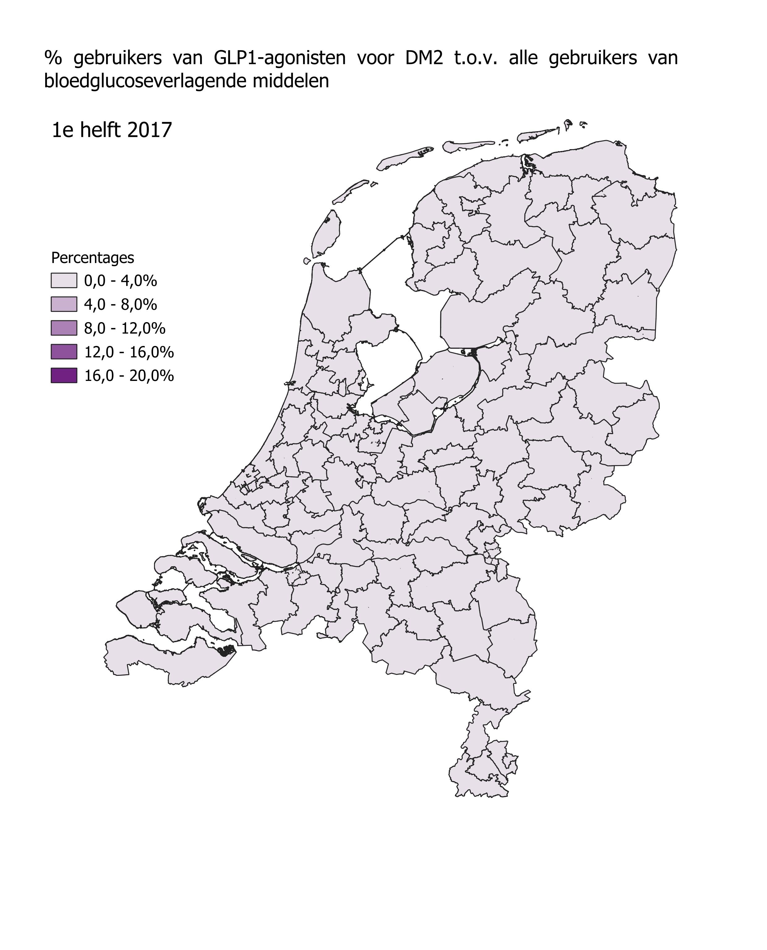 Aantal gebruikers van GLP1-agonisten: aantal unieke gebruikers van GLP1-agonisten, exclusief Saxenda® geregistreerd voor de indicatie obesitas per half jaar per postcodegebied.