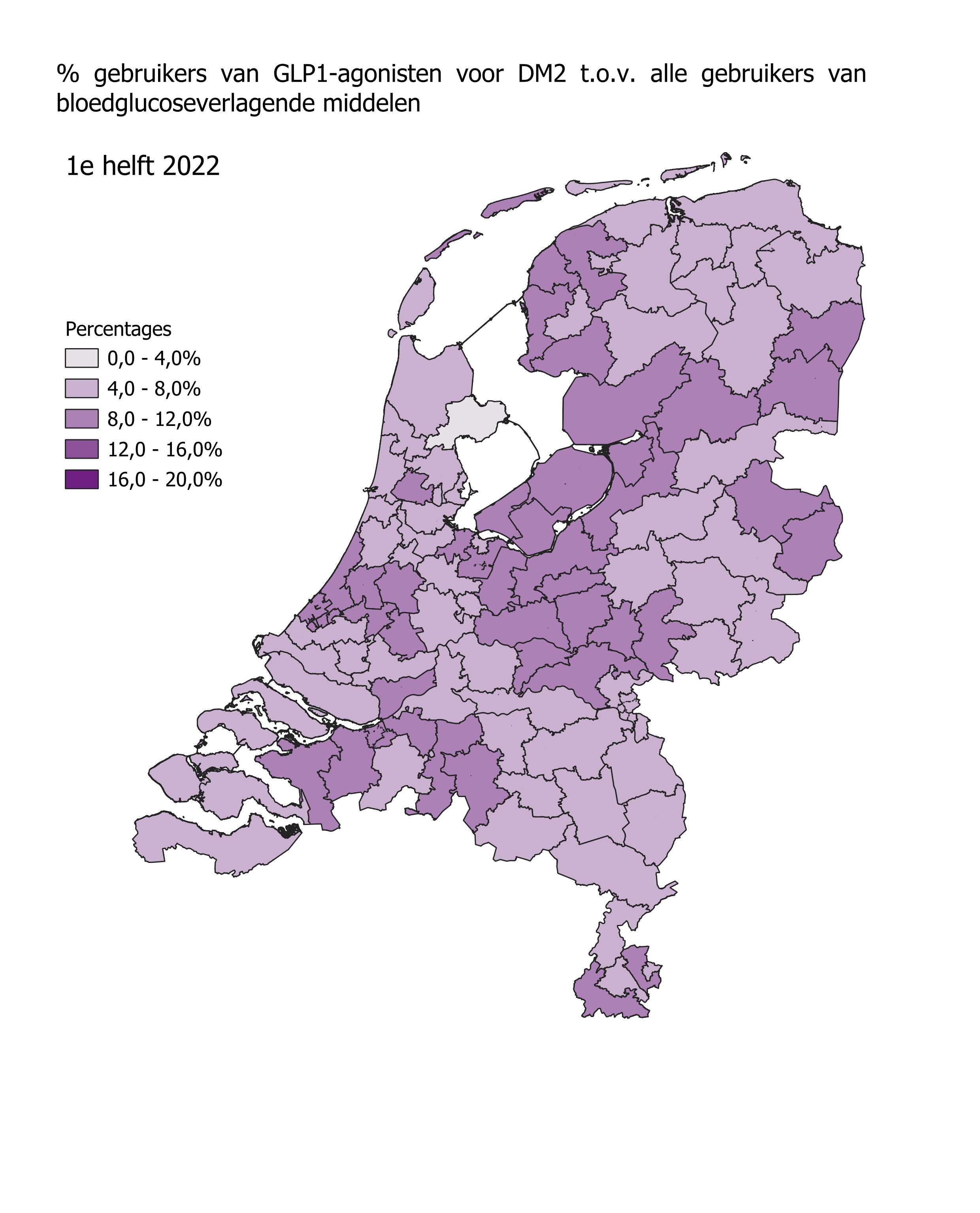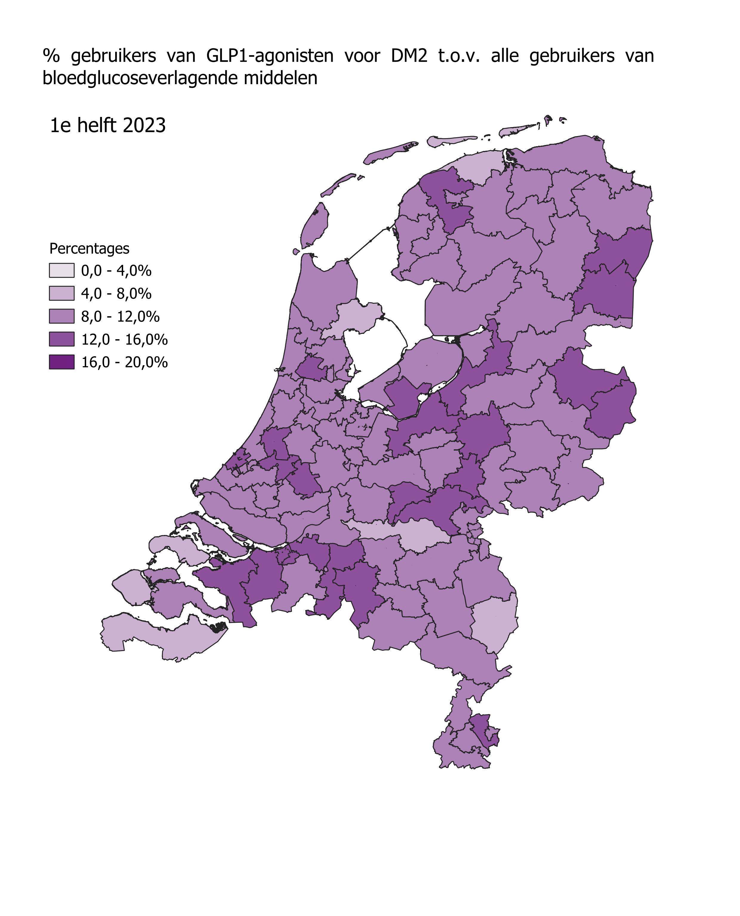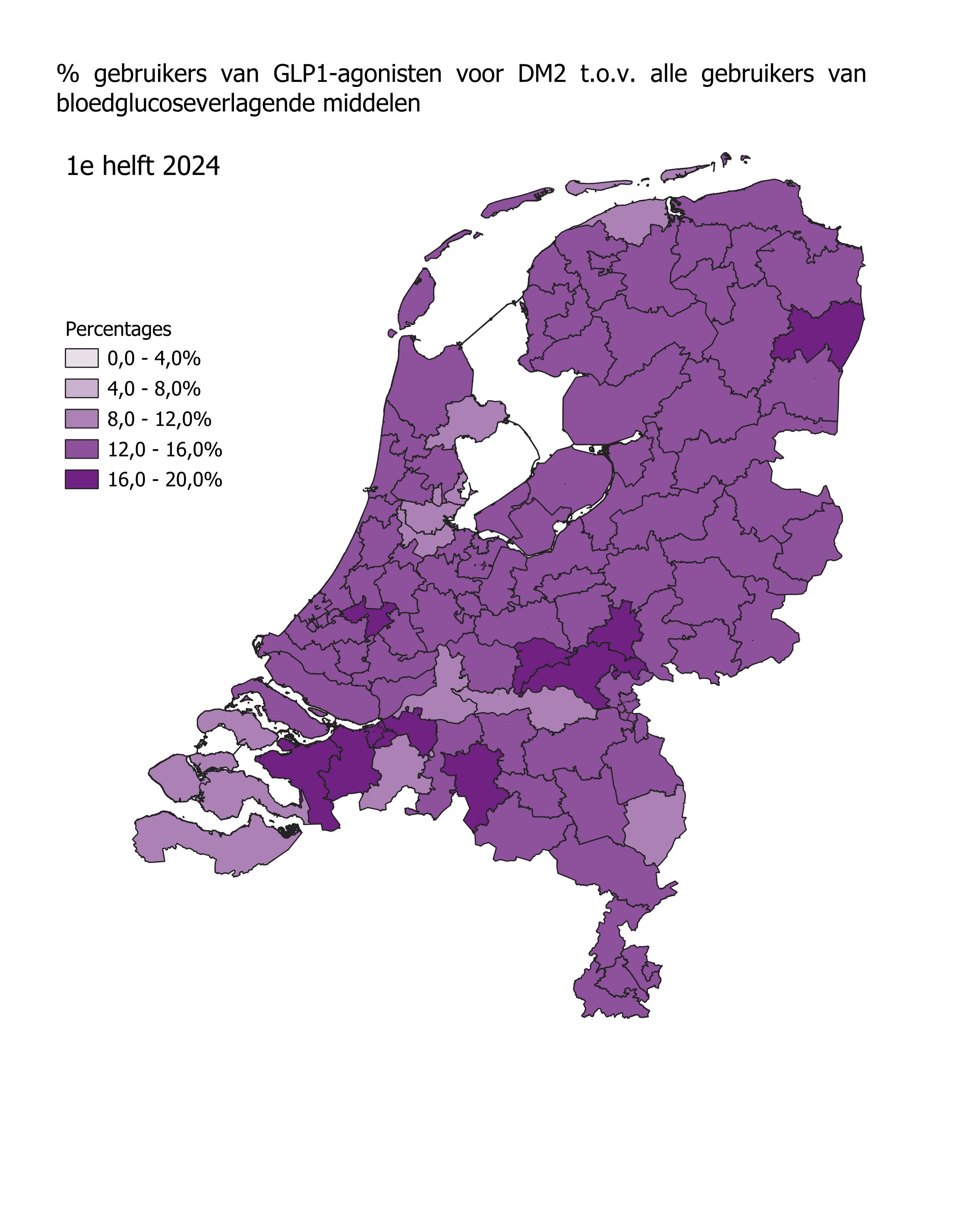 Het gebruik van GLP1-agonisten in de eerste helft van 2024 is het hoogst in Stadskanaal (17,8%) en Oosterhout (17,5%). In Hoorn en Breskens was het gebruik van GLP1-agonisten het laagst met respectievelijk 9,8% en 8,2%. In alle regio’s steeg het aantal gebruikers in de eerste helft van 2023 ten opzichte van de eerste helft van 2022. In Rotterdam en Doetinchem was die stijging het grootst met 47%. In Roden was de stijging het kleinst met 14,9%.