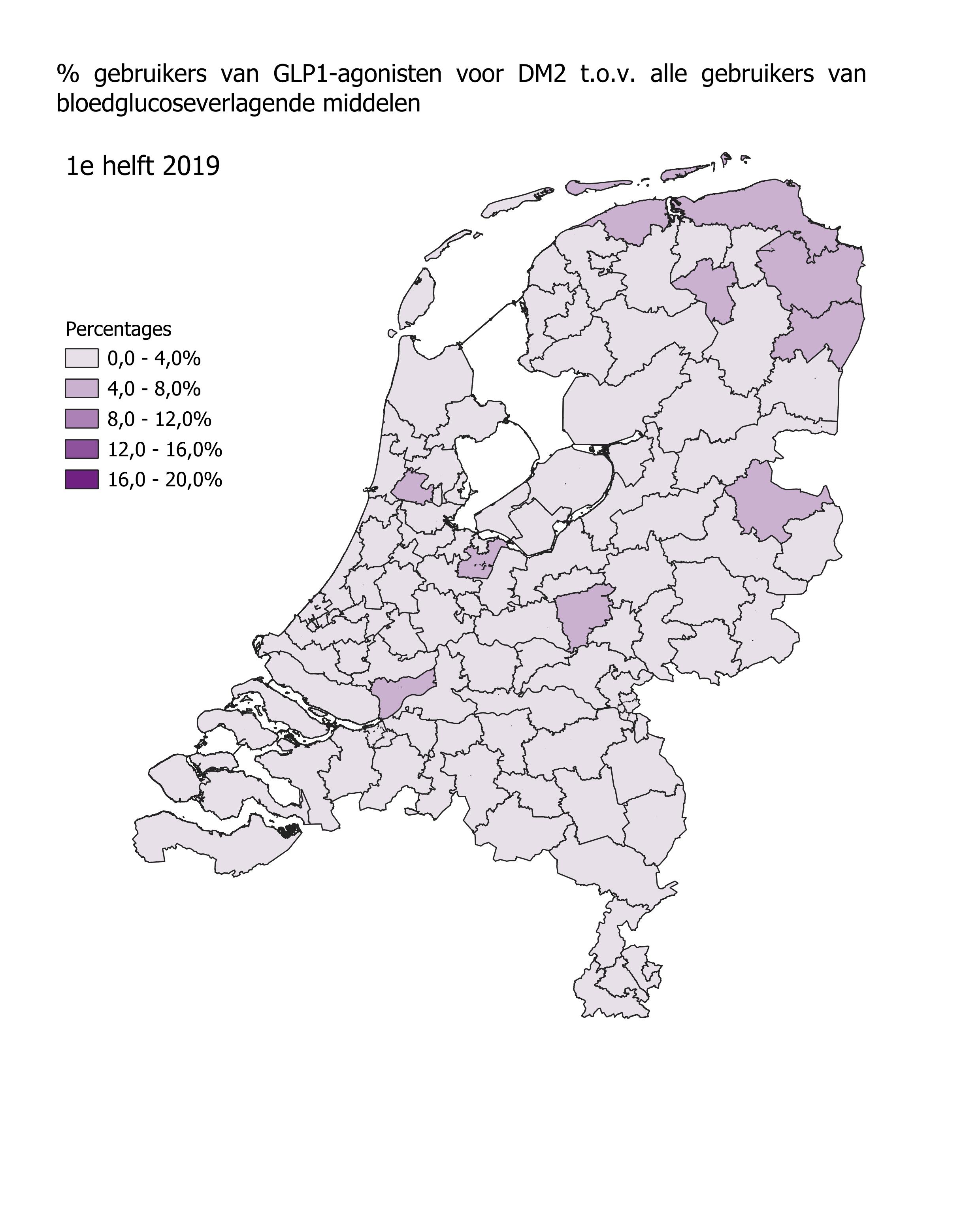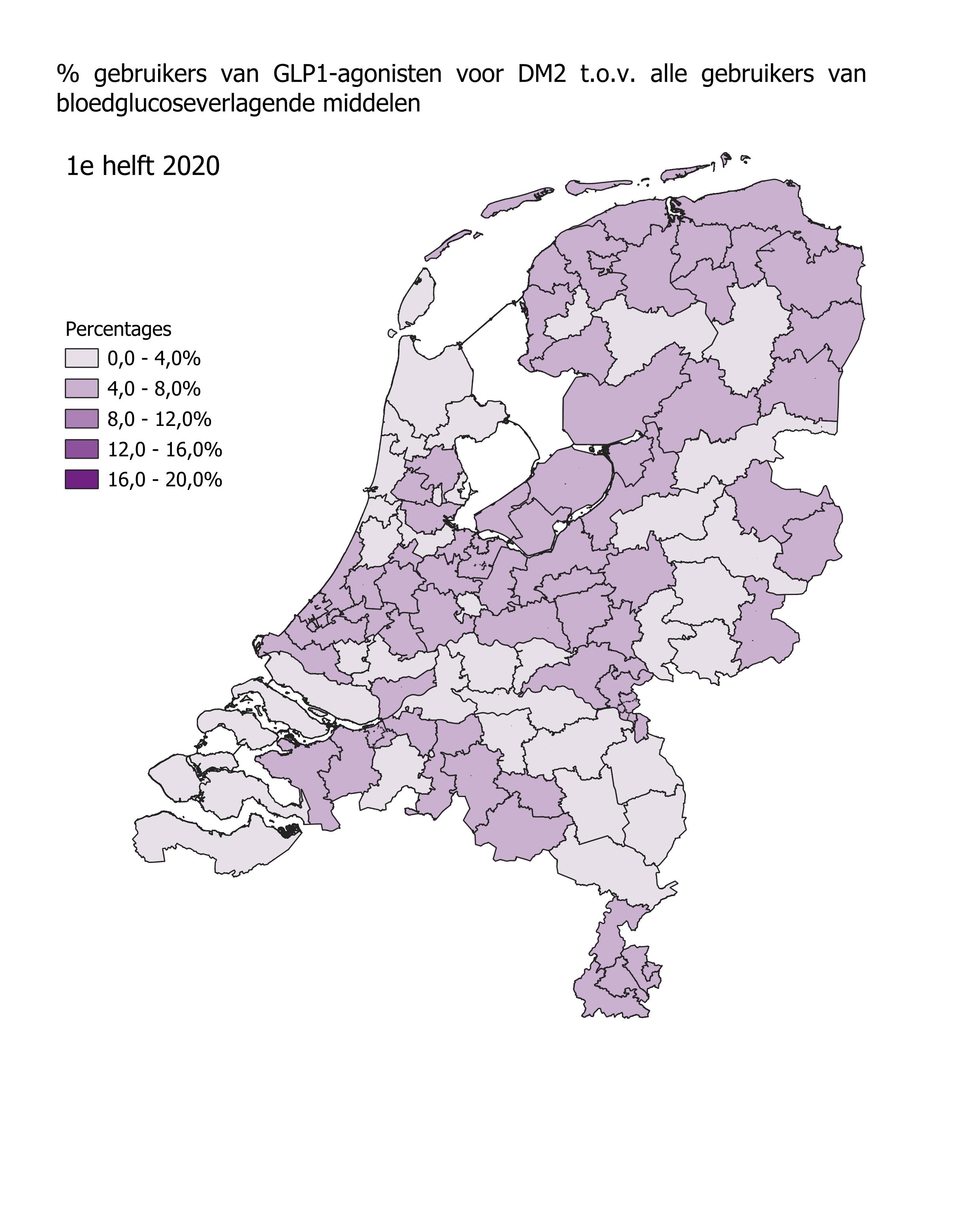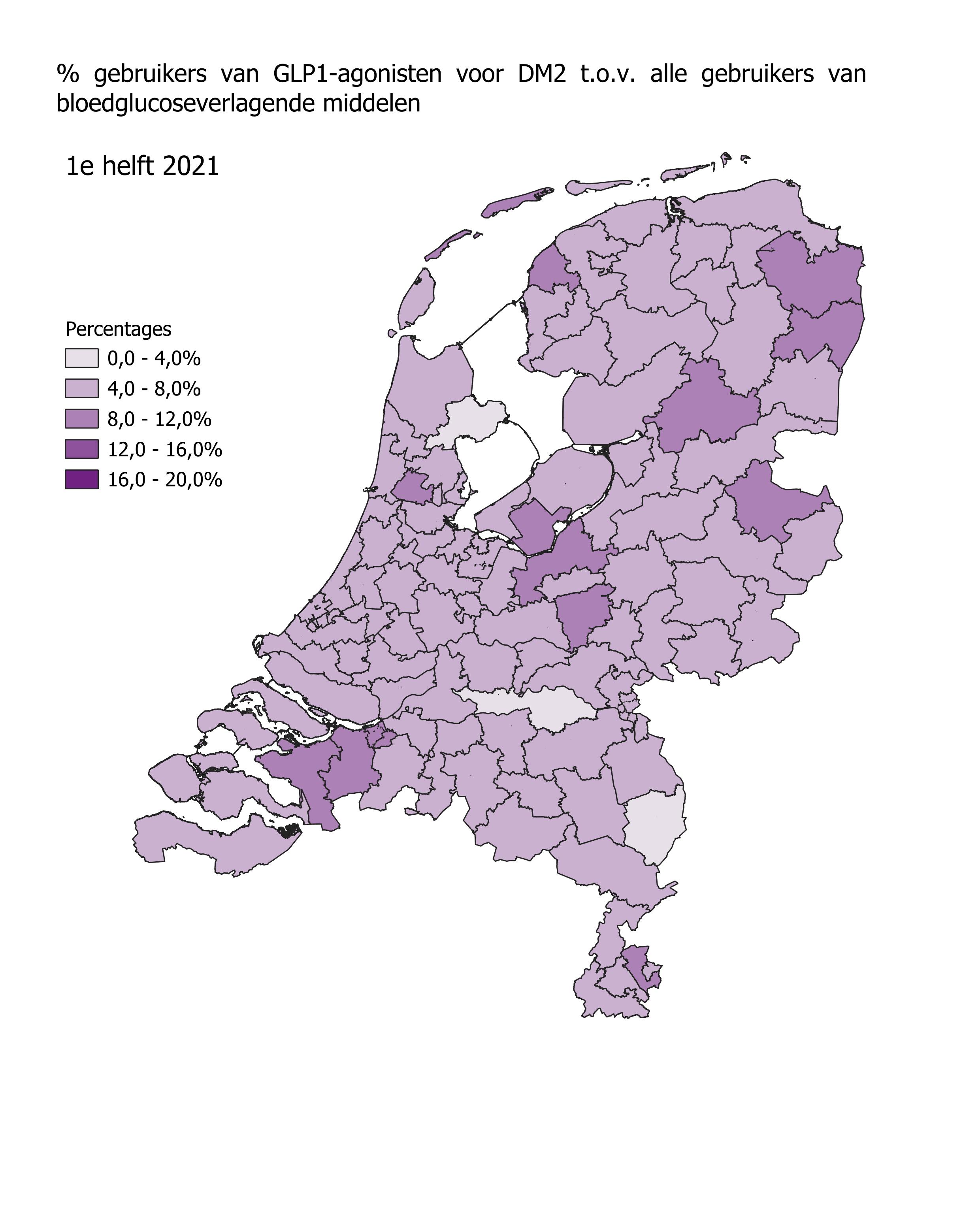 Het gebruik van GLP1-agonisten in de eerste helft van 2024 is het hoogst in Stadskanaal (17,8%) en Oosterhout (17,5%). In Hoorn en Breskens was het gebruik van GLP1-agonisten het laagst met respectievelijk 9,8% en 8,2%. In alle regio’s steeg het aantal gebruikers in de eerste helft van 2023 ten opzichte van de eerste helft van 2022. In Rotterdam en Doetinchem was die stijging het grootst met 47%. In Roden was de stijging het kleinst met 14,9%.