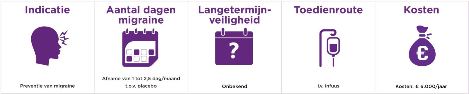 Eptinezumab is geregistreerd als profylactische behandeling voor volwassen patiënten met ten minste 4 dagen met migraine per maand (SmPC, 2024).