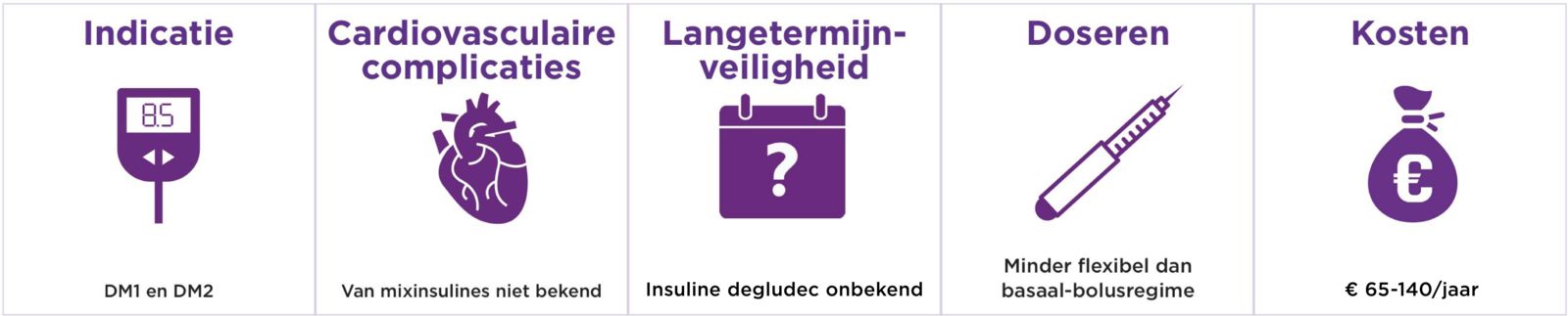 Er zijn geen zorgen over de langetermijnveiligheid van de mixinsulines die al geruime tijd in Nederland op de markt zijn. De langetermijnveiligheid van insuline degludec/insuline aspart is nog niet bekend. Dit middel is sinds 2014 in Nederland op de markt (SmPC, 2024). Er zijn geen specifieke zorgen over de langetermijnveiligheid van insuline degludec.