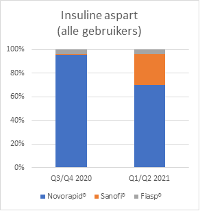 In figuur 1 en 2 valt op dat er in 2021 een grote verschuiving te zien is van het gebruik van het referentiegeneesmiddel insuline lispro (Humalog®) naar biosimilar insuline lispro (Sanofi®). Deze verschuiving is ook te zien van het referentiegeneesmiddel insuline aspart (Novorapid®) naar biosimilar insuline aspart (Sanofi®). In totaal zijn er ruim 43.800 nieuwe gebruikers van deze biosimilars gestart in de eerste helft van 2021. Naar schatting zijn er 30.000 patiënten met insuline aspart omgezet naar de biosimilar. Voor insuline lispro zijn dat ongeveer 1.900 patiënten.
