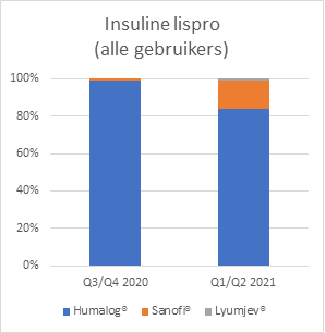 De snellerwerkende variant van insuline lispro (Lyumjev®) is sinds mei 2021 beschikbaar. Het aandeel van deze variant op het totale aantal gebruikers van insuline lispro is vooralsnog laag (< 1%). De snellerwerkende variant van insuline aspart (Fiasp®) is al langer op de markt, maar het aandeel op het totale aantal gebruikers van insuline aspart blijft laag. In Q3/Q4 2020 was het aandeel 4,2% en in de twee kwartalen daarna 3,9%.