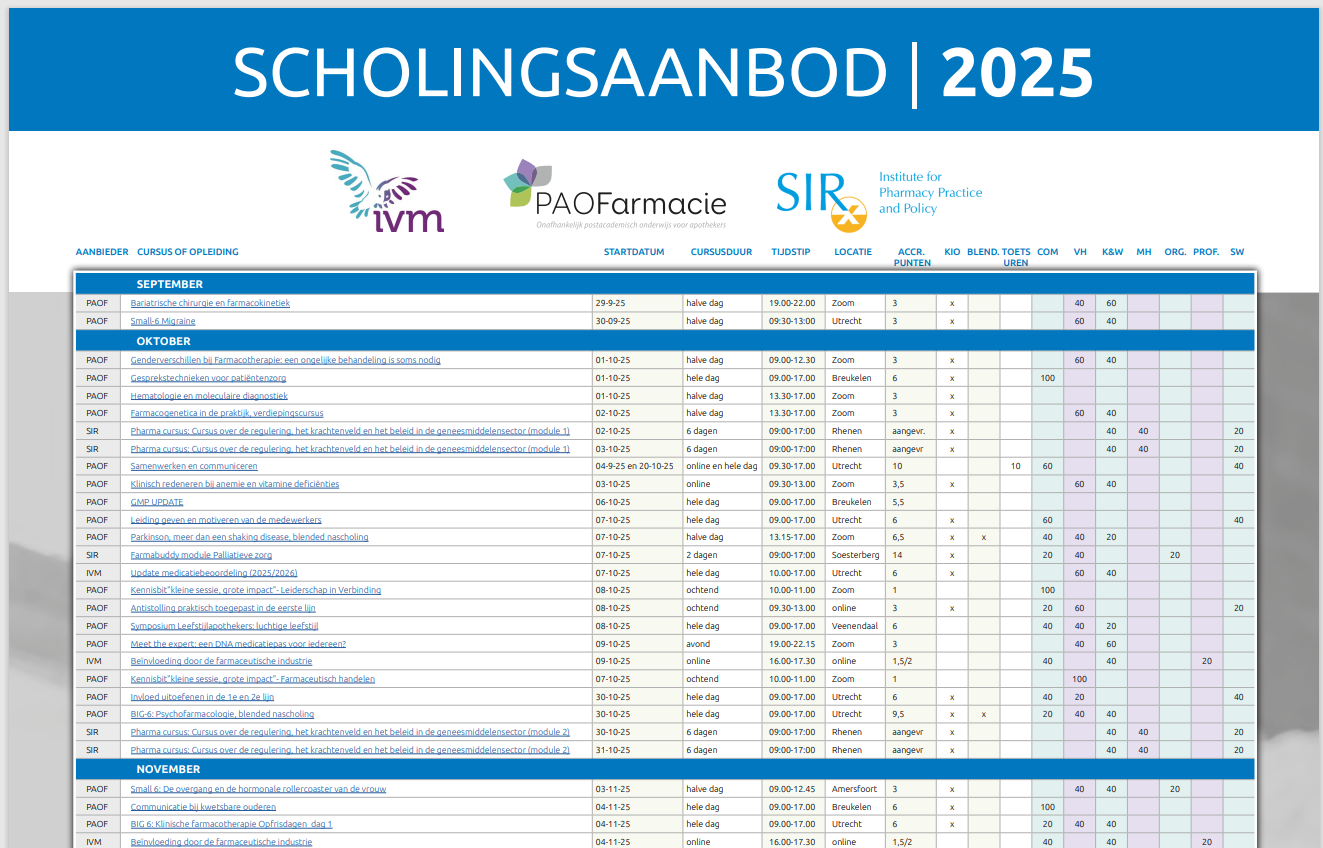 Een compleet scholingsaanbod voor apothekers van het CJI, SIR, PAOF en het IVM (2025).